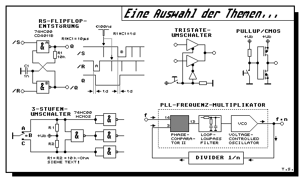 IM FOKUS ist eine neue Elektronik-Minikurs-Idee (Juni 2013). Es geht darum ein Thema in den Raum zu stellen, das von allgemeinem Fachinteresse ist. Dieses Thema wird so weit wie nötig erklärt. Oft bietet Wikipedia eine hervorragende einführende Erklärung, wenn es grundlegend mit Physik zu tun hat. Es werden Elektronik-Grundlagen- und Elektronik-Minikurse aus dem ELKO vorgestellt, wo das Thema in praktischer Form präsentiert wird. Ein praktischer Anlass kann sein, wenn ich feststelle, dass in Elektronik-Foren/Newsgruppen immer wieder die selben Inhalte befragt und diskutiert werden.Diesmal geht es um das Thema digitale Schaltungen und Projekte in den Elektronik-Minikursen. Eigentlich genügt dazu die Indexseite. Oft ist es jedoch so, dass der erste Schritt zur Lösung eines Problems, der Start einer Suchmaschine ist. Man findet u.a. rasch ein oder manchmal auch mehrere Links im ELKO, man liest diese und anderes übersieht man. Dieser Im-Fokus-Minikurs stellt alle Minikurse mit digitalen Inhalten auf einmal vor.
