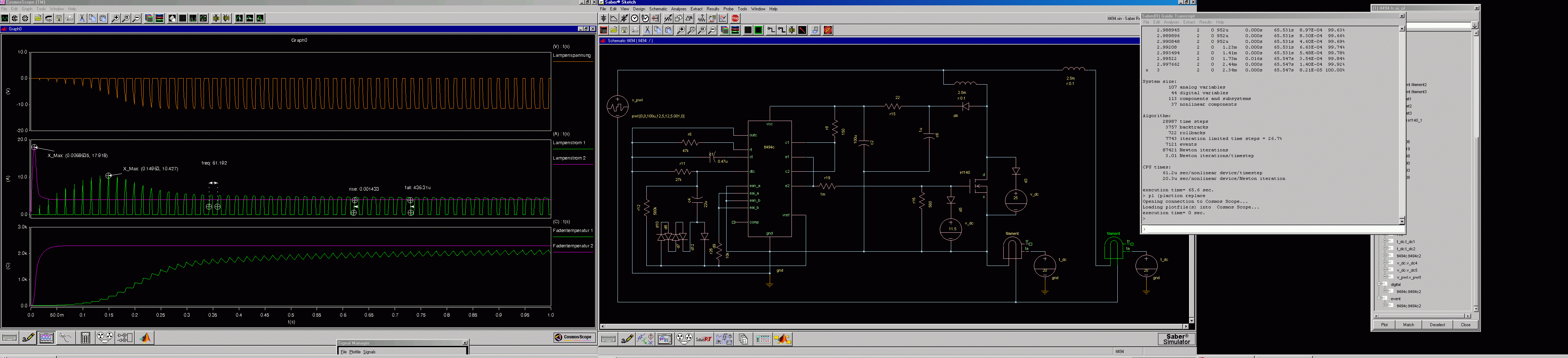 Anbei die damalige Simulation zu der Schaltung im Vergleich zu einer konventionell geschalteten Lampe. Das Lampenmodell ist zwar quantitativ nur oberflächlich aber qualitativ macht es den Sinn der Schaltung durchaus anschaulich.
